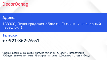 DecorOchag по адресу 188300, Ленинградская область, Гатчина, Инженерный переулок, 1 в дальнейшем Организация, размещена в следующих категориях: