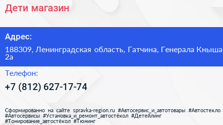 Дети, магазин по адресу 188309, Ленинградская область, Гатчина, Генерала Кныша, 2а в дальнейшем Организация, размещена в следующих категориях: