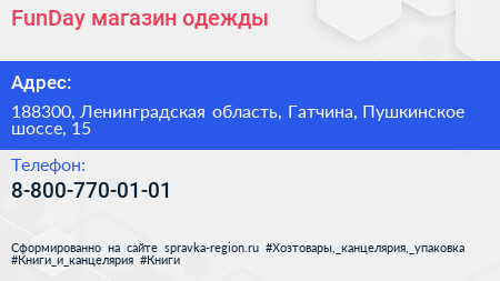 FunDay, магазин одежды по адресу 188300, Ленинградская область, Гатчина, Пушкинское шоссе, 15 в дальнейшем Организация, размещена в следующих категориях: