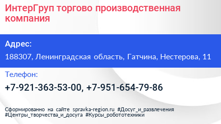 ИнтерГруп, торгово-производственная компания по адресу 188307, Ленинградская область, Гатчина, Нестерова, 11 в дальнейшем Организация, размещена в следующих категориях: