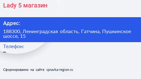 Lady 5, магазин по адресу 188300, Ленинградская область, Гатчина, Пушкинское шоссе, 15 в дальнейшем Организация, размещена в следующих категориях: