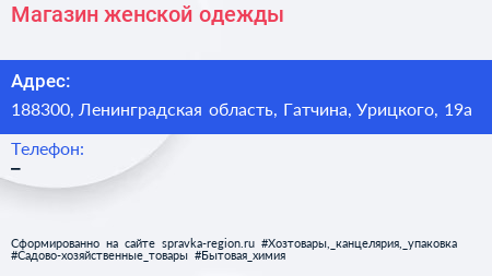 Магазин женской одежды по адресу 188300, Ленинградская область, Гатчина, Урицкого, 19а в дальнейшем Организация, размещена в следующих категориях: