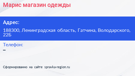 Марис, магазин одежды по адресу 188300, Ленинградская область, Гатчина, Володарского, 22Б в дальнейшем Организация, размещена в следующих категориях: