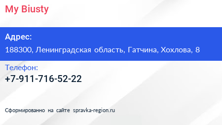 My Biusty по адресу 188300, Ленинградская область, Гатчина, Хохлова, 8 в дальнейшем Организация, размещена в следующих категориях:
