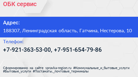 ОБК-сервис по адресу 188307, Ленинградская область, Гатчина, Нестерова, 10 в дальнейшем Организация, размещена в следующих категориях: