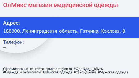 ОлМикс, магазин медицинской одежды по адресу 188300, Ленинградская область, Гатчина, Хохлова, 8 в дальнейшем Организация, размещена в следующих категориях: