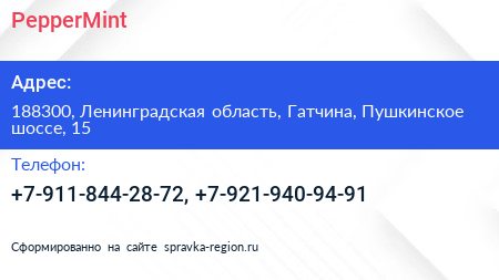 PepperMint по адресу 188300, Ленинградская область, Гатчина, Пушкинское шоссе, 15 в дальнейшем Организация, размещена в следующих категориях: