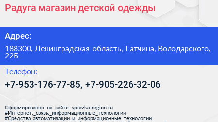 Радуга, магазин детской одежды по адресу 188300, Ленинградская область, Гатчина, Володарского, 22Б в дальнейшем Организация, размещена в следующих категориях: