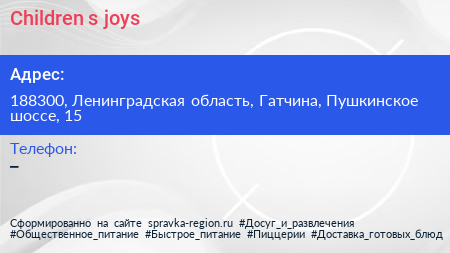 Сhildren`s joys по адресу 188300, Ленинградская область, Гатчина, Пушкинское шоссе, 15 в дальнейшем Организация, размещена в следующих категориях: