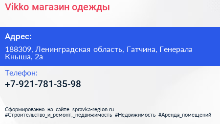 Vikko, магазин одежды по адресу 188309, Ленинградская область, Гатчина, Генерала Кныша, 2а в дальнейшем Организация, размещена в следующих категориях:
