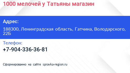 1000 мелочей у Татьяны, магазин по адресу 188300, Ленинградская область, Гатчина, Володарского, 22Б в дальнейшем Организация, размещена в следующих категориях: