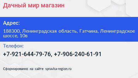 Дачный мир, магазин по адресу 188300, Ленинградская область, Гатчина, Ленинградское шоссе, 10в в дальнейшем Организация, размещена в следующих категориях: