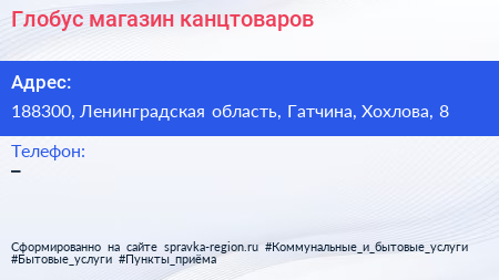 Глобус, магазин канцтоваров по адресу 188300, Ленинградская область, Гатчина, Хохлова, 8 в дальнейшем Организация, размещена в следующих категориях: