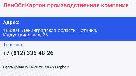 ЛенОблКартон, производственная компания по адресу 188304, Ленинградская область, Гатчина, Индустриальная, 25 в дальнейшем Организация, размещена в следующих категориях:
