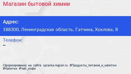 Магазин бытовой химии по адресу 188300, Ленинградская область, Гатчина, Хохлова, 8 в дальнейшем Организация, размещена в следующих категориях: