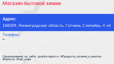 Магазин бытовой химии по адресу 188309, Ленинградская область, Гатчина, Слепнёва, 4 к4 в дальнейшем Организация, размещена в следующих категориях: