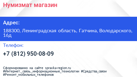 Нумизмат, магазин по адресу 188300, Ленинградская область, Гатчина, Володарского, 16д в дальнейшем Организация, размещена в следующих категориях: