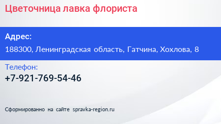 Цветочница, лавка флориста по адресу 188300, Ленинградская область, Гатчина, Хохлова, 8 в дальнейшем Организация, размещена в следующих категориях: