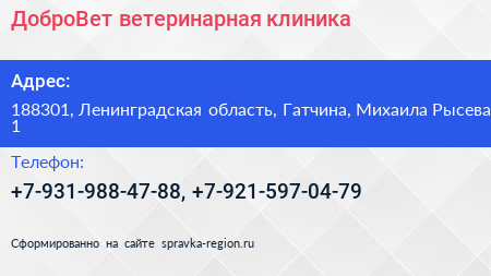 ДоброВет, ветеринарная клиника по адресу 188301, Ленинградская область, Гатчина, Михаила Рысева, 1 в дальнейшем Организация, размещена в следующих категориях: