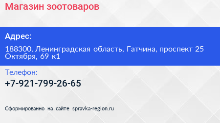 Магазин зоотоваров по адресу 188300, Ленинградская область, Гатчина, проспект 25 Октября, 69 к1 в дальнейшем Организация, размещена в следующих категориях: