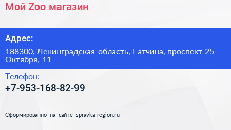Мой Zoo, магазин по адресу 188300, Ленинградская область, Гатчина, проспект 25 Октября, 11 в дальнейшем Организация, размещена в следующих категориях: