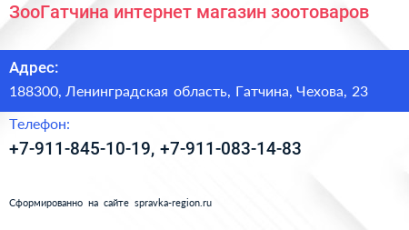 ЗооГатчина, интернет-магазин зоотоваров по адресу 188300, Ленинградская область, Гатчина, Чехова, 23 в дальнейшем Организация, размещена в следующих категориях: