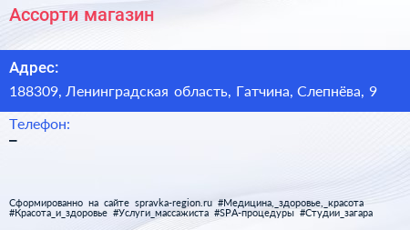 Ассорти, магазин по адресу 188309, Ленинградская область, Гатчина, Слепнёва, 9 в дальнейшем Организация, размещена в следующих категориях: