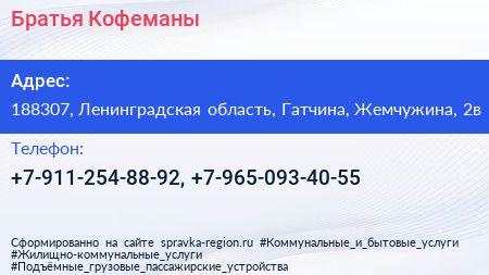 Братья Кофеманы по адресу 188307, Ленинградская область, Гатчина, Жемчужина, 2в в дальнейшем Организация, размещена в следующих категориях: