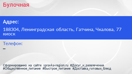 Булочная по адресу 188304, Ленинградская область, Гатчина, Чкалова, 77 киоск в дальнейшем Организация, размещена в следующих категориях: