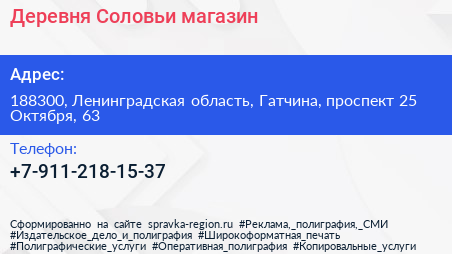 Деревня Соловьи, магазин по адресу 188300, Ленинградская область, Гатчина, проспект 25 Октября, 63 в дальнейшем Организация, размещена в следующих категориях: