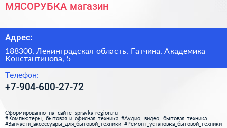 МЯСОРУБКА, магазин по адресу 188300, Ленинградская область, Гатчина, Академика Константинова, 5 в дальнейшем Организация, размещена в следующих категориях: