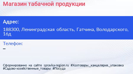 Магазин табачной продукции по адресу 188300, Ленинградская область, Гатчина, Володарского, 16д в дальнейшем Организация, размещена в следующих категориях: