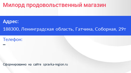 Милорд, продовольственный магазин по адресу 188300, Ленинградская область, Гатчина, Соборная, 29т в дальнейшем Организация, размещена в следующих категориях: