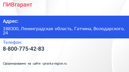 ПИВгарант по адресу 188300, Ленинградская область, Гатчина, Володарского, 24 в дальнейшем Организация, размещена в следующих категориях: