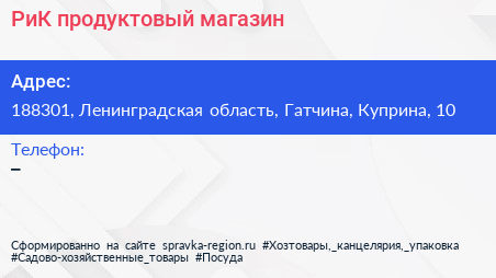 РиК, продуктовый магазин по адресу 188301, Ленинградская область, Гатчина, Куприна, 10 в дальнейшем Организация, размещена в следующих категориях: