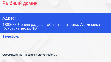 Рыбный домик по адресу 188300, Ленинградская область, Гатчина, Академика Константинова, 10 в дальнейшем Организация, размещена в следующих категориях:
