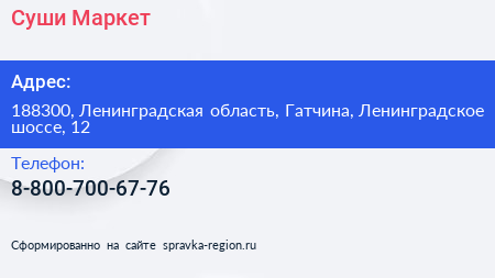 Суши-Маркет по адресу 188300, Ленинградская область, Гатчина, Ленинградское шоссе, 12 в дальнейшем Организация, размещена в следующих категориях: