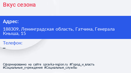 Вкус сезона по адресу 188309, Ленинградская область, Гатчина, Генерала Кныша, 15 в дальнейшем Организация, размещена в следующих категориях: