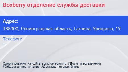 Boxberry, отделение службы доставки по адресу 188300, Ленинградская область, Гатчина, Урицкого, 19 в дальнейшем Организация, размещена в следующих категориях: