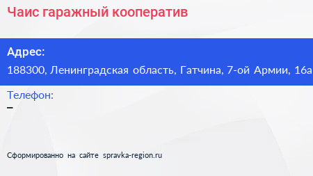 Чаис, гаражный кооператив по адресу 188300, Ленинградская область, Гатчина, 7-ой Армии, 16а в дальнейшем Организация, размещена в следующих категориях: