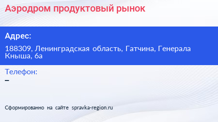 Аэродром, продуктовый рынок по адресу 188309, Ленинградская область, Гатчина, Генерала Кныша, 6а в дальнейшем Организация, размещена в следующих категориях: