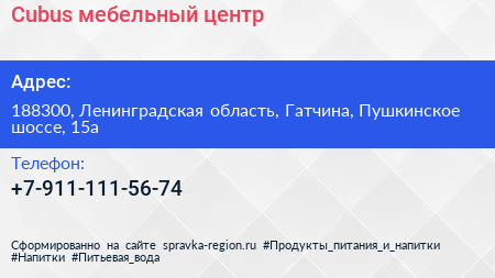 Cubus, мебельный центр по адресу 188300, Ленинградская область, Гатчина, Пушкинское шоссе, 15а в дальнейшем Организация, размещена в следующих категориях: