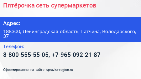 Пятёрочка, сеть супермаркетов по адресу 188300, Ленинградская область, Гатчина, Володарского, 37 в дальнейшем Организация, размещена в следующих категориях:
