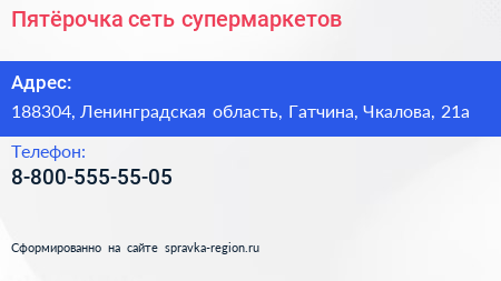 Пятёрочка, сеть супермаркетов по адресу 188304, Ленинградская область, Гатчина, Чкалова, 21а в дальнейшем Организация, размещена в следующих категориях: