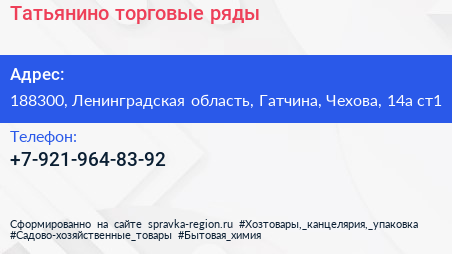 Татьянино, торговые ряды по адресу 188300, Ленинградская область, Гатчина, Чехова, 14а ст1 в дальнейшем Организация, размещена в следующих категориях: