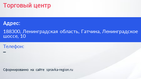 Торговый центр по адресу 188300, Ленинградская область, Гатчина, Ленинградское шоссе, 10 в дальнейшем Организация, размещена в следующих категориях: