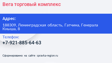 Вега, торговый комплекс по адресу 188309, Ленинградская область, Гатчина, Генерала Кныша, 8 в дальнейшем Организация, размещена в следующих категориях: