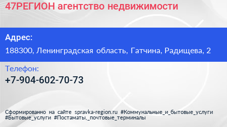 47РЕГИОН, агентство недвижимости по адресу 188300, Ленинградская область, Гатчина, Радищева, 2 в дальнейшем Организация, размещена в следующих категориях: