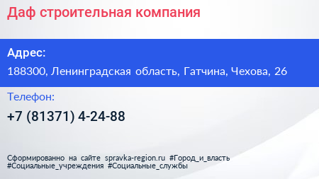 Даф, строительная компания по адресу 188300, Ленинградская область, Гатчина, Чехова, 26 в дальнейшем Организация, размещена в следующих категориях:
