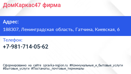 ДомКаркас47, фирма по адресу 188307, Ленинградская область, Гатчина, Киевская, 6 в дальнейшем Организация, размещена в следующих категориях: